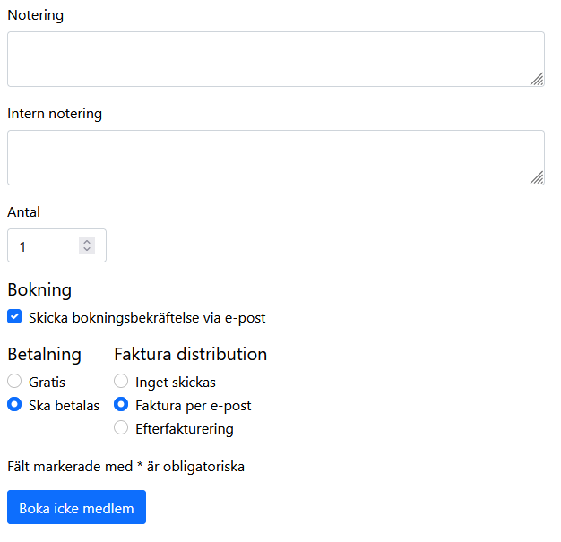• Inget skickas – Det skickas inte ut någon faktura, men skapas upp en faktura på medlemsposten. Bokar du någon som saknar eller har en felaktig e-postadress kan du välja detta alternativ. Gå sedan in på medlemsposten så kan du printa och posta fakturan istället.