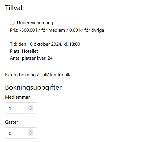Här kan du välja antal medlemmar och antal gäster som du ska boka. Notera att du som administratör kan boka hur många du vill oavsett om evenemanget är fullbokat. Är det ett evenemang som kostar kan det bli skillnad i pris om du bokar övriga deltagare som "Medlem" eller "Gäst".