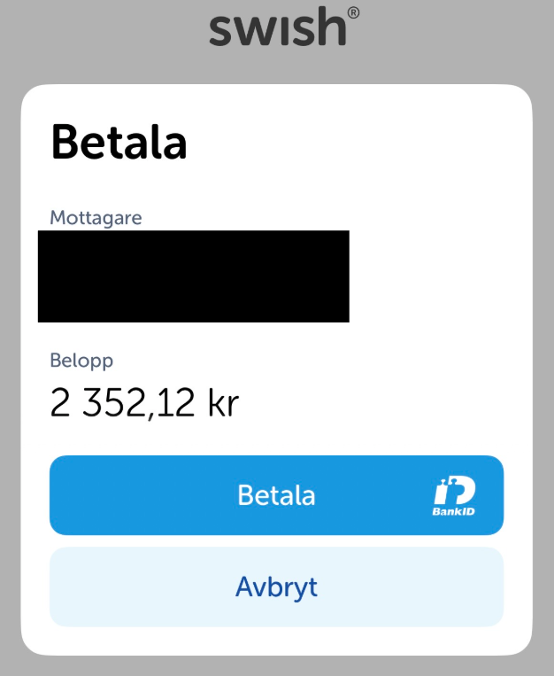 När de öppnar sin Swish-app kan de välja att signera betalningen med BankID eller avbryta: